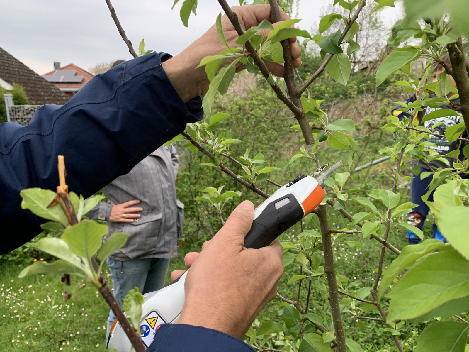 Vorstandsmitglied Maximilian hatte uns freundlicherweise darauf aufmerksam gemacht, dass der junge Baum dringend einen Formschnitt benötige. Also griffen Lothar und Lena kurzerhand zur Schere – und das war auch höchste Zeit. Der Apfelbaum war bereits deutlich aus der Form geraten. Besonders die senkrecht nach oben wachsende Triebe mussten entfernt werden, da sie dem Baum langfristig schaden und keine Früchte tragen würden.