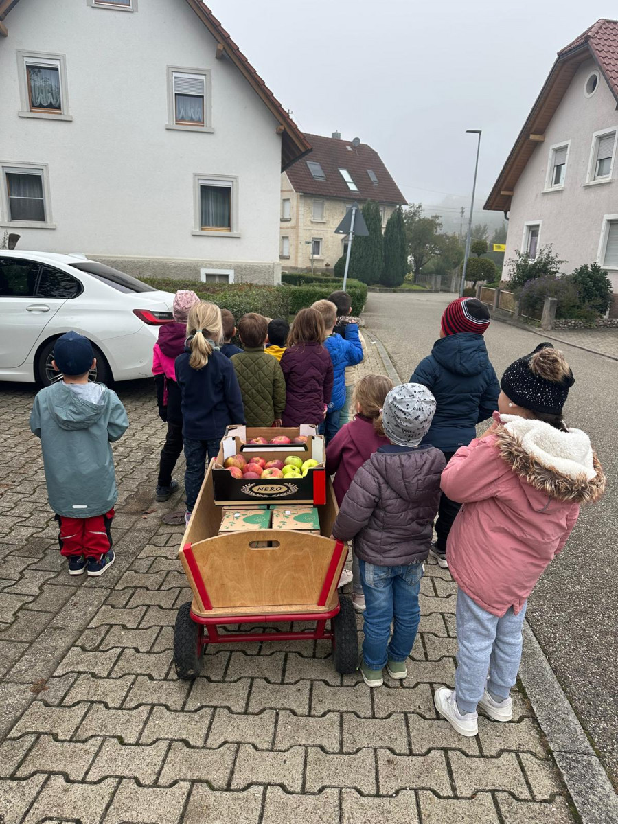 Die Vereinsmitglieder Bruno Schaubrenner, Hans-Peter Riehle und Lena Einsele überbrachten die Spenden persönlich. Zuvor hatten die Mitglieder des Vereins die Äpfel auf der Streuobstwiese im Bereich „Killweg“ im Gewann Steinacker geerntet. Dort stehen zahlreiche Hochstammbäume, deren Früchte sorgfältig von Hand gelesen wurden. Der Apfelsaft wurde anschließend frisch für die Kinder gepresst.