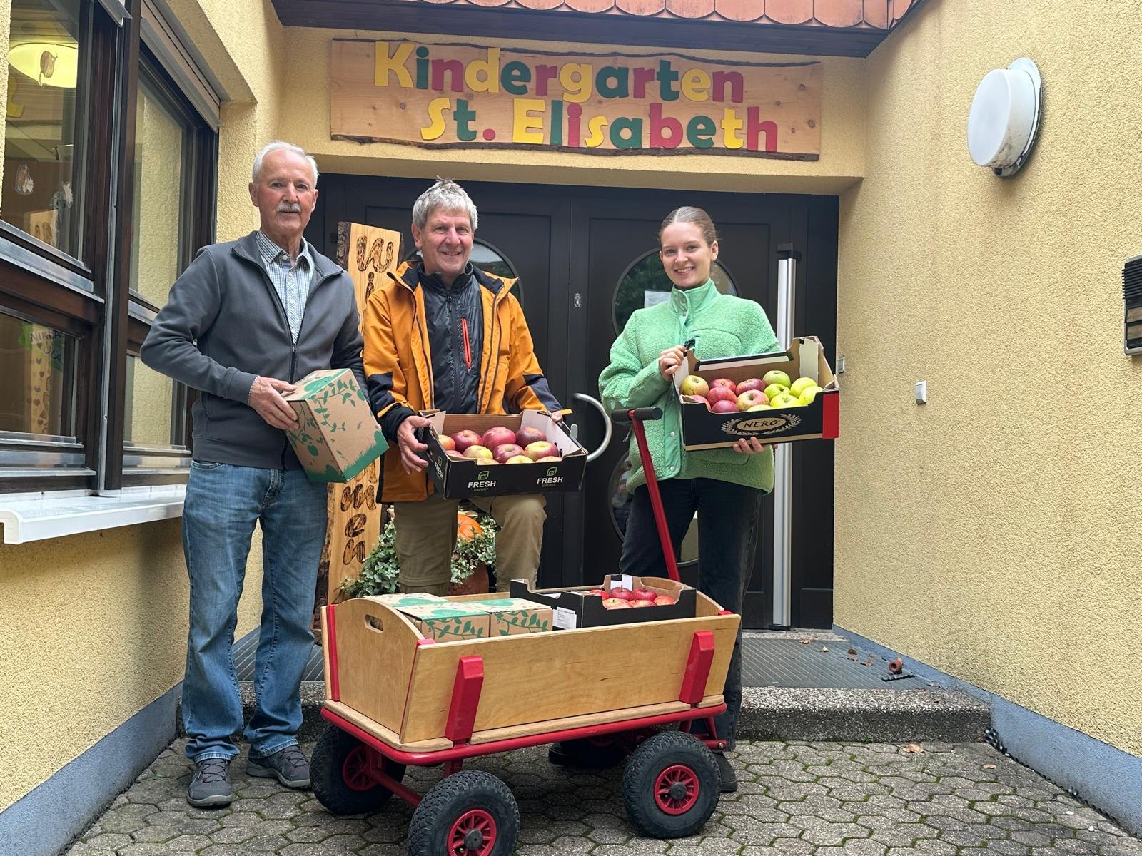 Große Freude herrschte bei den Kindern der Kindergärten St. Franziskus und St. Elisabeth, als sie die Kisten mit frischen Äpfeln und den leckeren Apfelsaft vom Obst- und Gartenbauverein entgegennehmen durften. Jede Einrichtung erhielt vier Kisten voll heimischem Obst von der Streuobstwiese sowie 20 Liter frisch gepressten Apfelsaft.