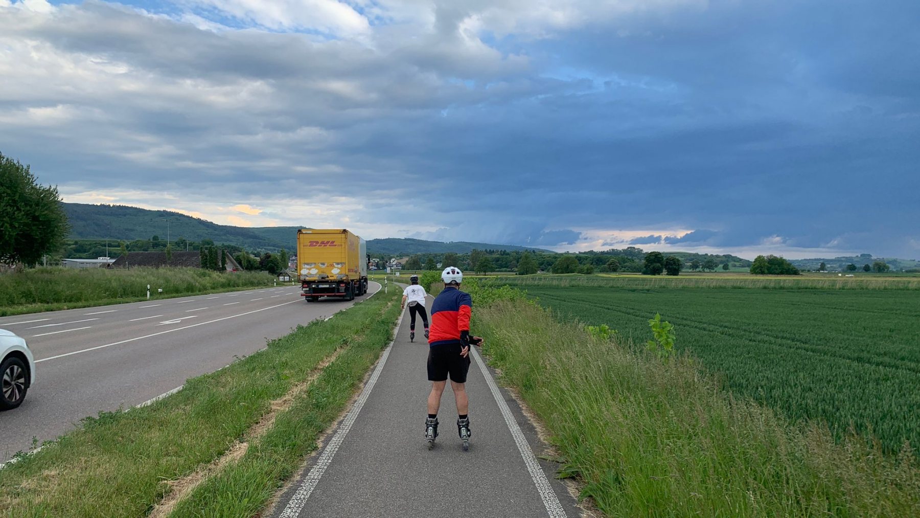 Zum Auftakt gab es ein kurzes Fahrtraining, bevor wir uns auf unsere Tour in Richtung des Gewerbegebiets Niederschopfheim begaben. Dort legten wir noch einmal eine kleine Übungseinheit ein, um unsere Technik zu verbessern. Nachdem wir nun schon 45 Minuten auf den Rollen unterwegs waren, machten wir uns wieder auf den Rückweg zur Streuobstwiese.