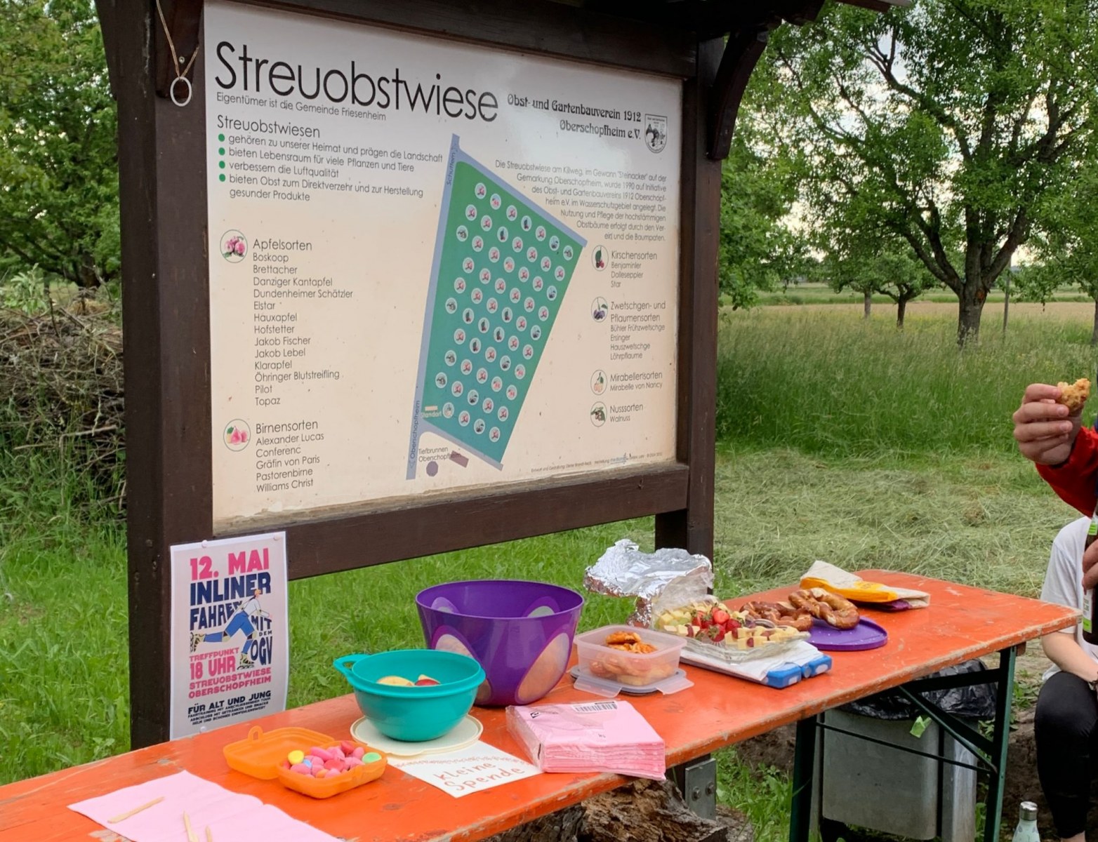 Dort wurden wir bereits von weiteren Besucherinnen, Besuchern und Vereinsmitgliedern empfangen. Das reichhaltige Snack-Buffet und erfrischende Getränke kamen bei allen gut an – für jede und jeden war etwas dabei! Den Abend ließen wir bei einem herrlichen Sonnenuntergang gemütlich an der Streuobstwiese ausklingen.