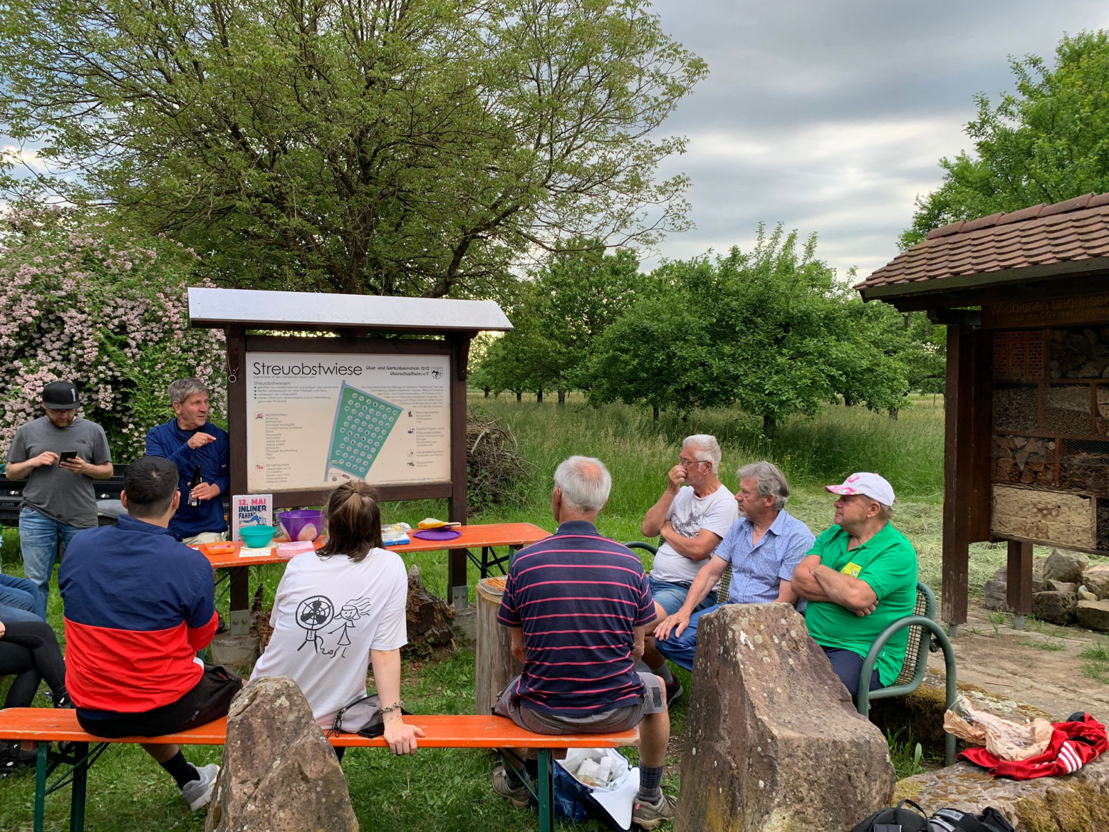 Dort wurden wir bereits von weiteren Besucherinnen, Besuchern und Vereinsmitgliedern empfangen. Das reichhaltige Snack-Buffet und erfrischende Getränke kamen bei allen gut an – für jede und jeden war etwas dabei! Den Abend ließen wir bei einem herrlichen Sonnenuntergang gemütlich an der Streuobstwiese ausklingen.