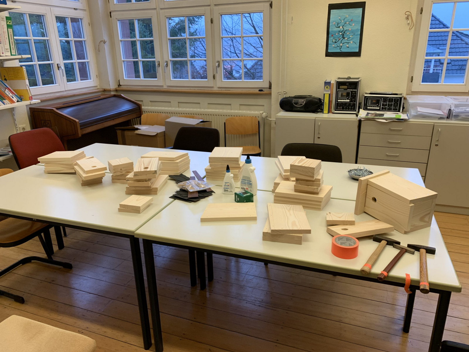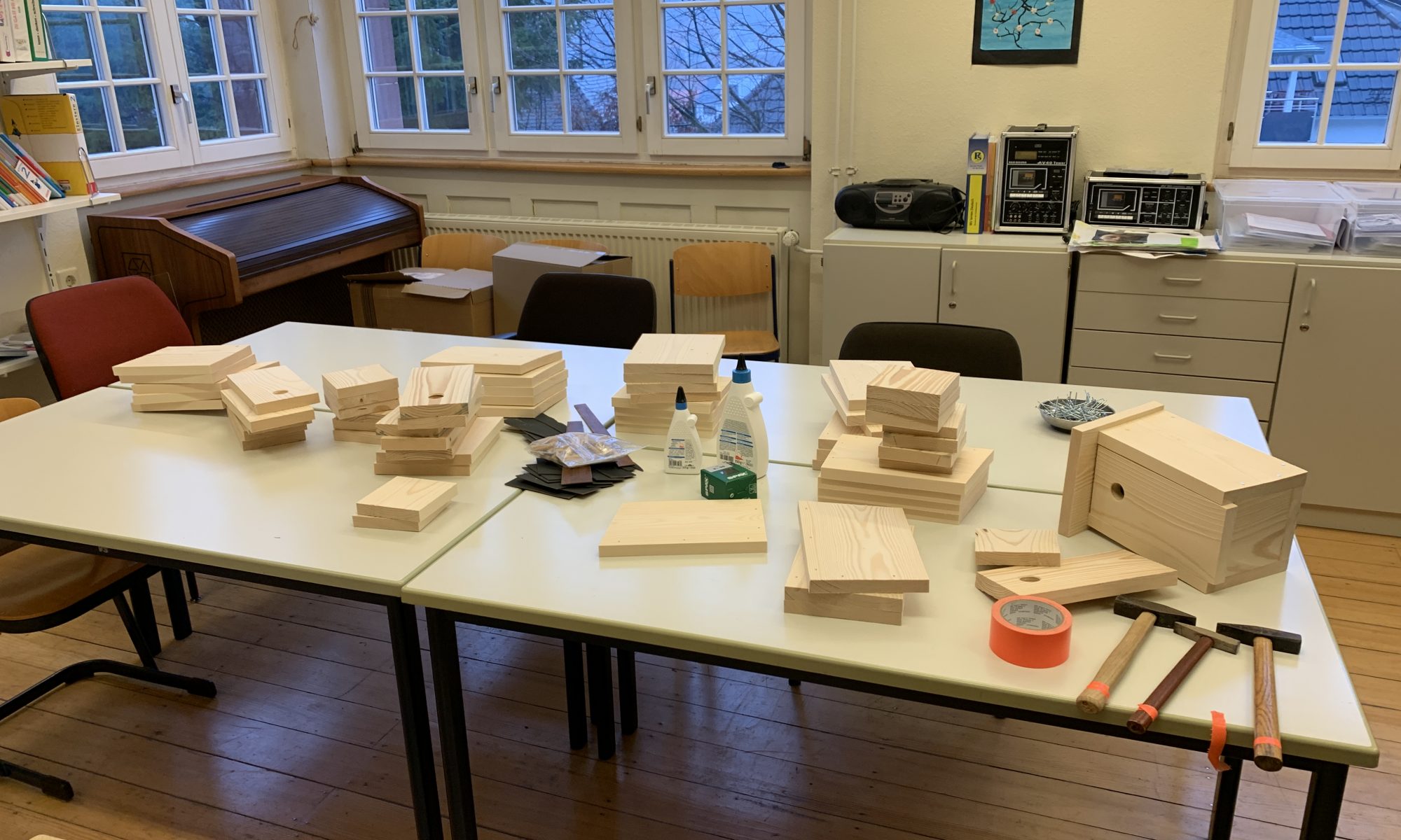 Die Holzzuschnitte wurden vom Förderverein der Grundschule gestiftet, der sie wiederum über die Justizvollzugsanstalt Offenburg beziehen konnte. Der Obst- und Gartenbauverein stellte Holzleim und Nägel bereit, sodass die Kinder direkt mit dem Zusammenbau beginnen konnten. Mit großer Begeisterung und handwerklichem Geschick entstanden zahlreiche individuelle Nistkästen.