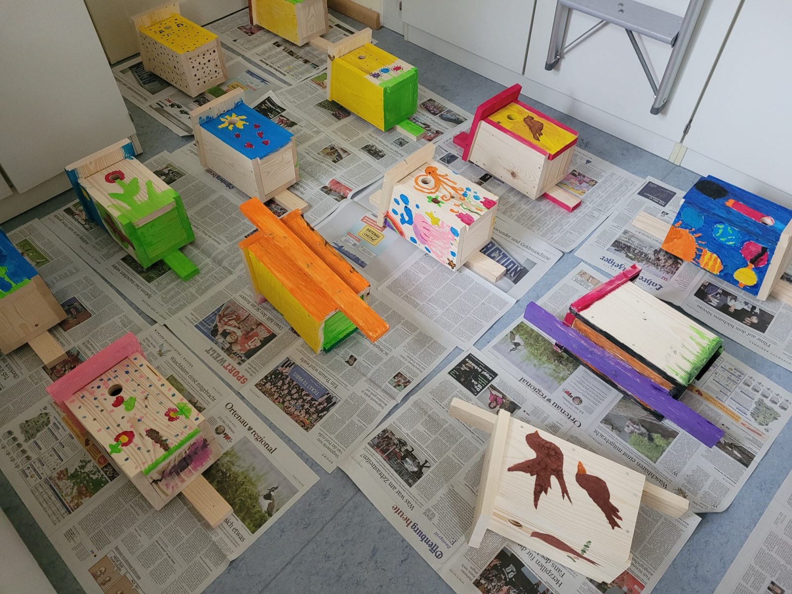 Damit die fertigen Nistkästen noch eine persönliche Note erhielten, wurden sie im Kunstunterricht der Schule kreativ gestaltet. Jedes Kind durfte seinen eigenen Nistkasten mit nach Hause nehmen, um ihn im Garten oder auf dem Balkon aufzuhängen und somit einen Beitrag zum Schutz der Vogelwelt zu leisten.