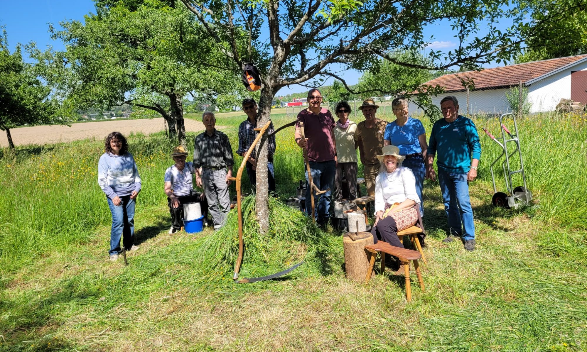 Nochmals Dank an Familie Reminder, die es an diesem Morgen geschafft hat alle TeilnehmerInnen das wichtige Dengeln und das dann köstliche Mähen zu ermöglichen.