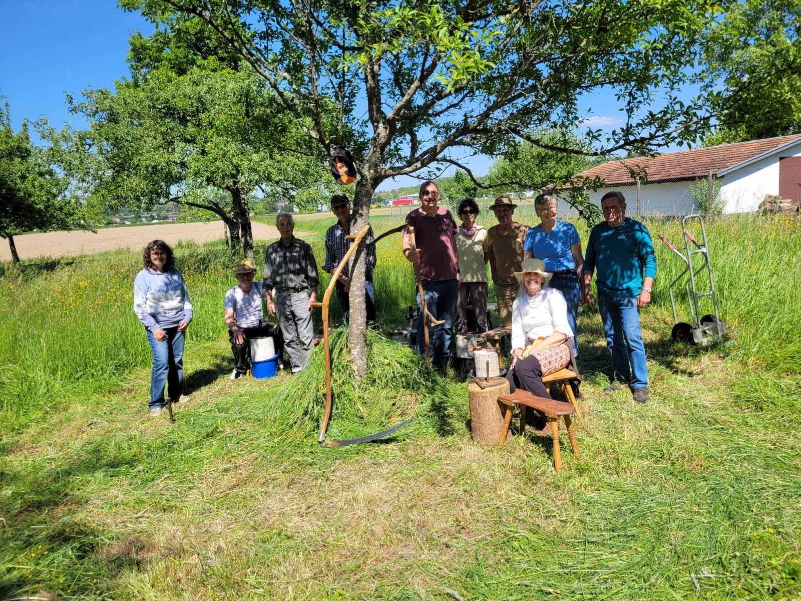 Nochmals Dank an Familie Reminder, die es an diesem Morgen geschafft hat alle TeilnehmerInnen das wichtige Dengeln und das dann köstliche Mähen zu ermöglichen.
