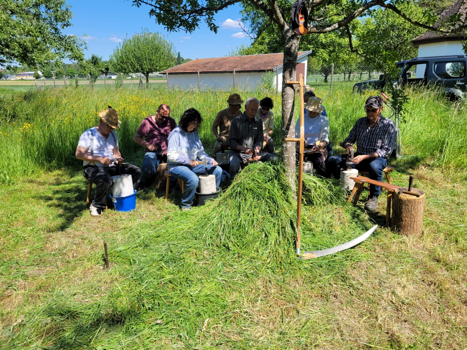 Nochmals Dank an Familie Reminder, die es an diesem Morgen geschafft hat alle TeilnehmerInnen das wichtige Dengeln und das dann köstliche Mähen zu ermöglichen.