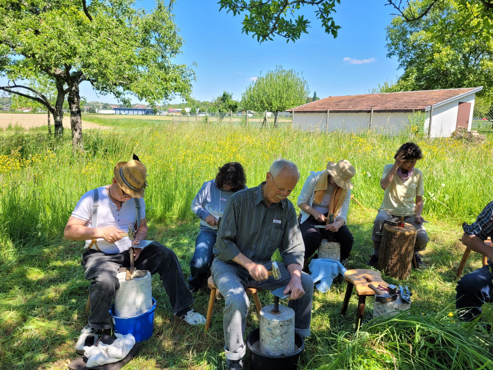 Im Frühtau am Morgen des 10.5. trafen sich 8 Interessierte, die sich in der Kunst des Dengelns und der Sensenmahd unterweisen lassen wollten.