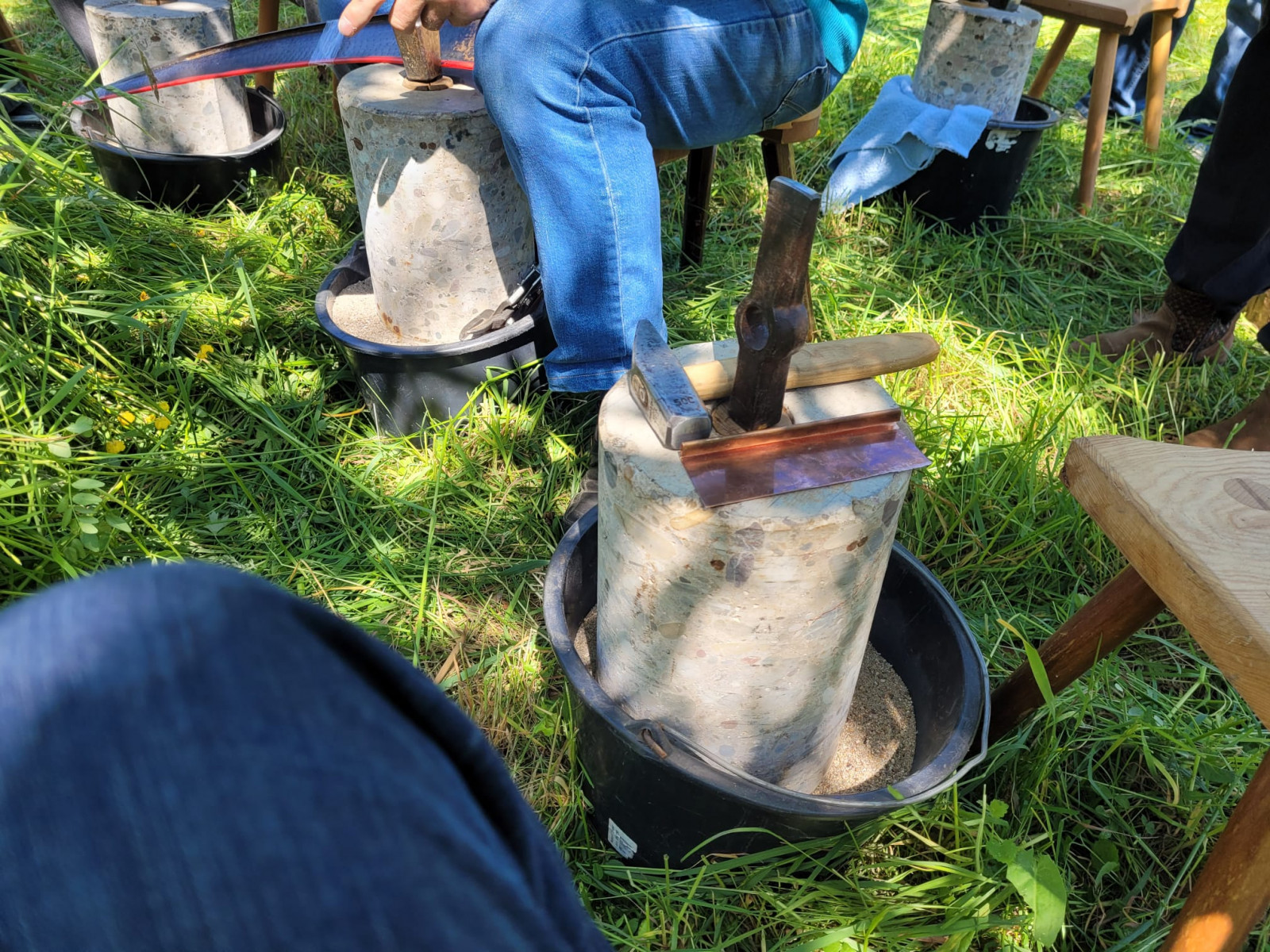 Die Sensenwerkstatt Reminder kam mit gut geschärften Sensen für Jedermann und Jederfrau, Höckerchen und unterschiedliche Dengelvorrichtung und ihrer mobilen ambulanten Werkstatt, wo zum Schluss noch altgediente Sensen von einzelnen Teilnehmern sich ein doch zum Teil sehr notwendiges technischen up date zukommen lassen konnten.