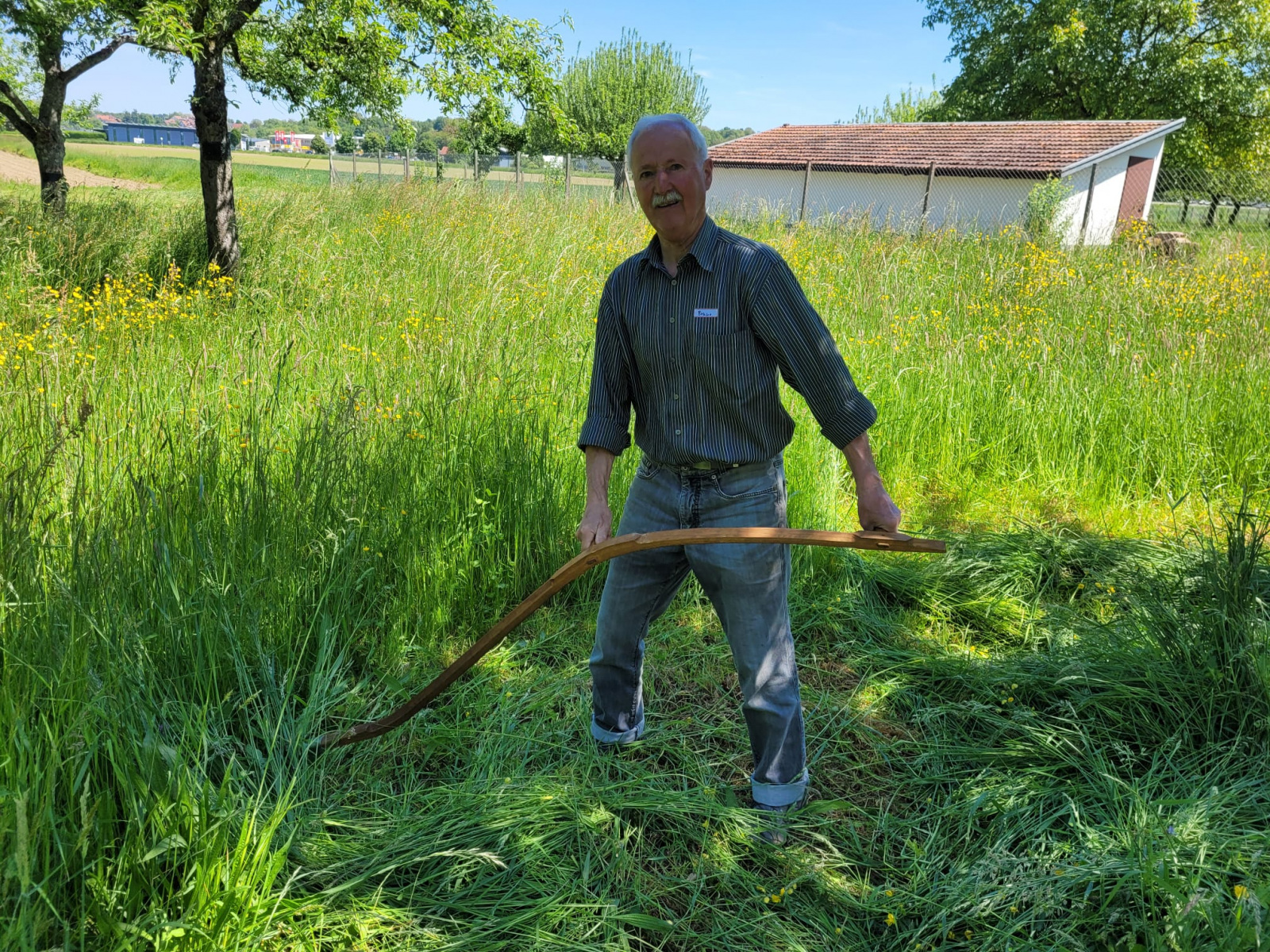 Im Frühtau am Morgen des 10.5. trafen sich 8 Interessierte, die sich in der Kunst des Dengelns und der Sensenmahd unterweisen lassen wollten.
