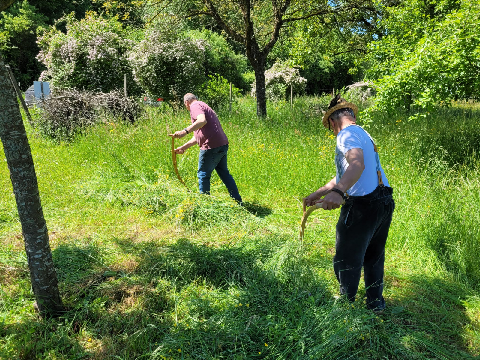 Nochmals Dank an Familie Reminder, die es an diesem Morgen geschafft hat alle TeilnehmerInnen das wichtige Dengeln und das dann köstliche Mähen zu ermöglichen.