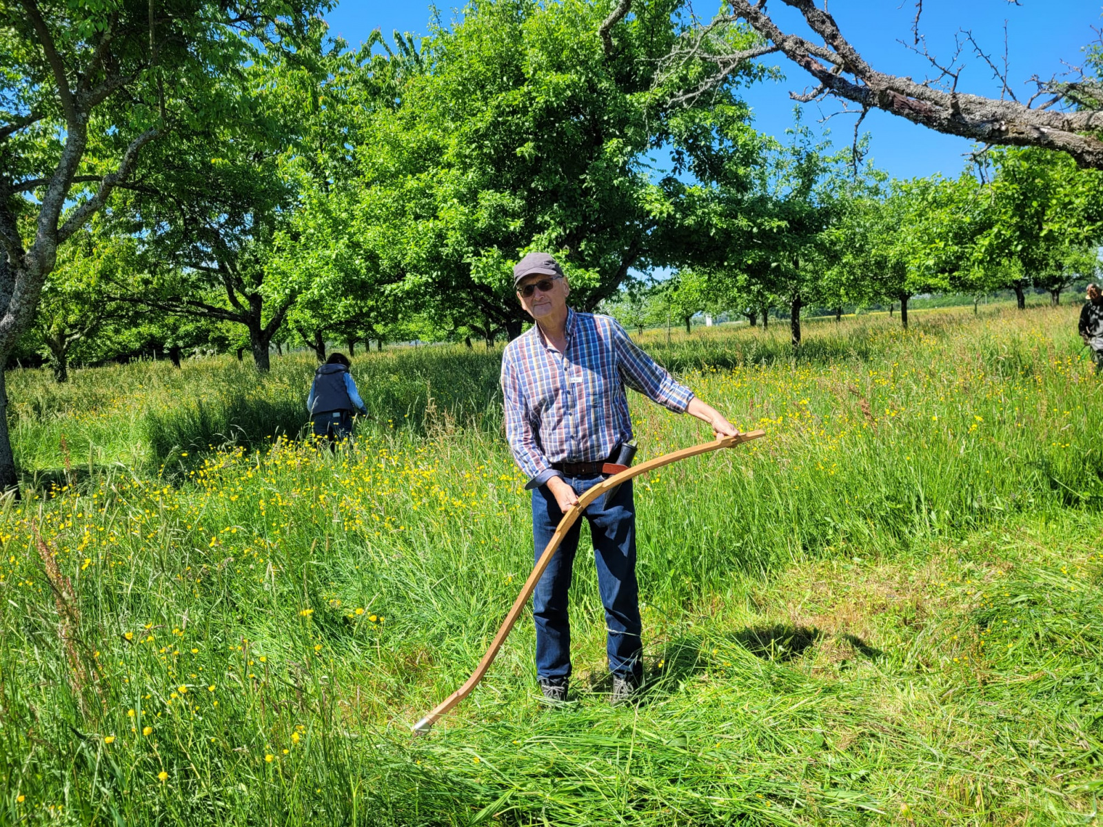 Nochmals Dank an Familie Reminder, die es an diesem Morgen geschafft hat alle TeilnehmerInnen das wichtige Dengeln und das dann köstliche Mähen zu ermöglichen.