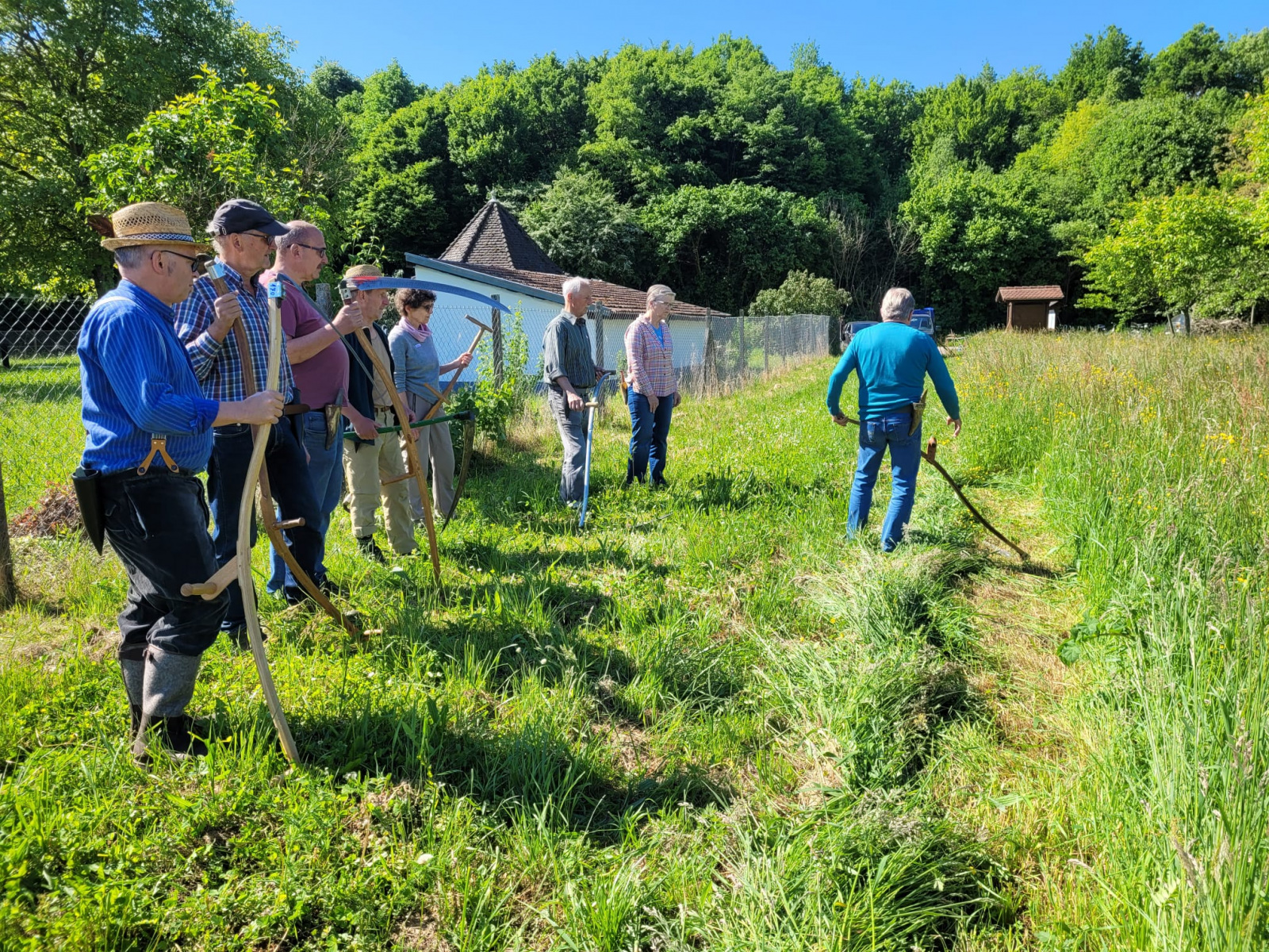 Nochmals Dank an Familie Reminder, die es an diesem Morgen geschafft hat alle TeilnehmerInnen das wichtige Dengeln und das dann köstliche Mähen zu ermöglichen.